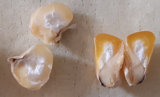 Bilden nedan visar korn av vit respektive gul flintmajs i genomskärning. Mestadels hård glasartad frövita, men mjuk kritvit frövita i mitten.